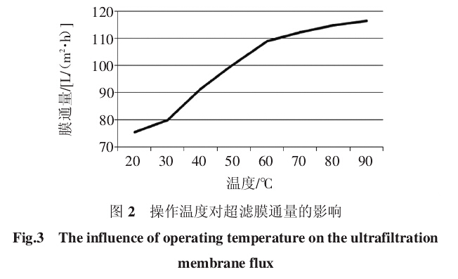 從圖2可以看出,隨著溫度升高,L-阿拉伯糖發(fā) 酵液在超濾膜分離中的膜通量逐漸增大,因此,升高 溫度有助于提高超濾膜的膜通量。但從試驗(yàn)中發(fā)現(xiàn), 如果操作溫度過高,會使L-阿拉伯糖發(fā)酵液產(chǎn)生焦糊 味,嚴(yán)重影響發(fā)酵液的質(zhì)量,并且造成資源浪費(fèi),能耗 升高,根據(jù)試驗(yàn)結(jié)果并結(jié)合實(shí)際生產(chǎn)條件和設(shè)備要 求,選擇超濾膜運(yùn)行的操作溫度為50 °C。