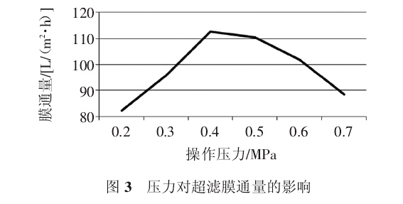 由圖3可以看出,隨著操作壓力的增大,超濾膜對 L-阿拉伯糖發(fā)酵液的膜通量隨之增大,當(dāng)壓力增大到 0.4 MPa后,超濾膜的膜通量急劇下降。這是因?yàn)槌瑸V 分離過程中只有當(dāng)工作壓力達(dá)到一定數(shù)值,才能使發(fā) 酵液中的L-阿拉伯糖、木糖、水等小分子物質(zhì)透過超 濾膜與酵母、菌體、膠質(zhì)、蛋白等大分子物質(zhì)分離,當(dāng)工 作壓力太小時(shí),小分子的濾液透過量少,膜通量小,隨 著壓力的增大,小分子的濾液透過量也增大,膜通量 隨之增大,但工作壓力太大時(shí),會增加超濾膜極化層 的厚度,抵消增壓的增速效果,同時(shí)也會把沉積在超 濾膜上的沉積層壓實(shí),難以被沖刷,膜孔很快被堵塞, 影響過濾效果,導(dǎo)致膜通量下降,因此,在試驗(yàn)中選擇 的超濾膜的操作壓力為0.4 MPa。